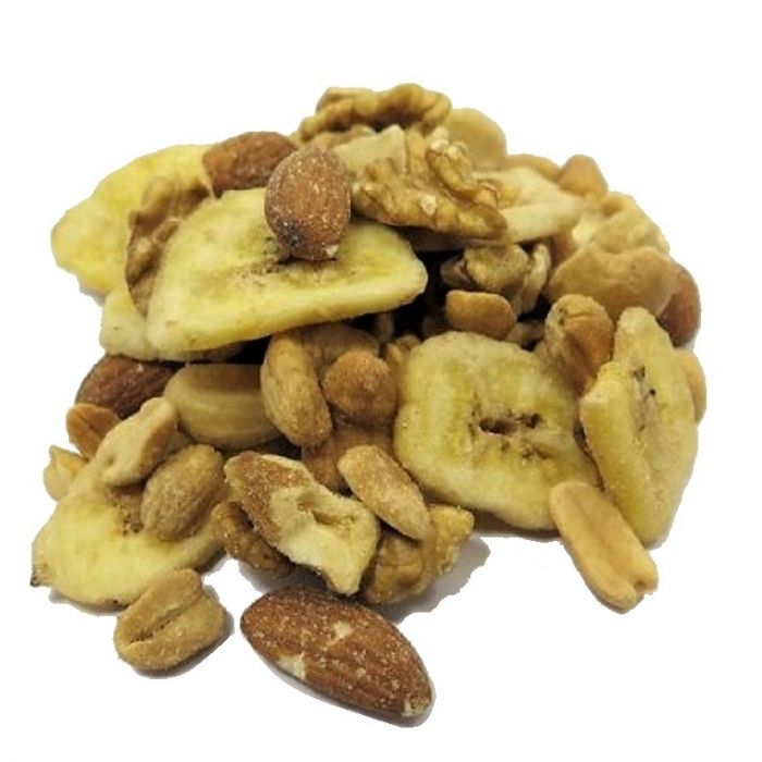 Ingredientes: Banana chips, castañas de cajú tostadas, almendra tostada, nueces y maní repelado y tostado.
